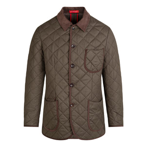 Crafted from English wool and quilted in England, this jacket provides warmth in a very light weight package. It features our signature curved barchetta pockets and a patch ticket pocket. The edges are trimmed in Brisbane Moss fine wale corduroy. It is shaped and waisted and cut from a jacket block as opposed to most quilted jackets that are flat and shapeless.