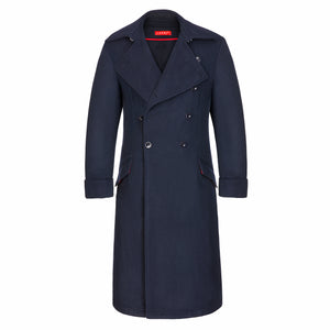 Our great coat is based on one of our popular bespoke commissions, our interpretation of a Russian military great coat. It features the closing lapels and throat hooks of the original that keep the elements out, and the action back that allows for incredible freedom of movement - originally intended to allow the throwing of grenades and firing of rifles - thankfully it also makes lifting a pint glass much easier or sabering a bottle of champagne.