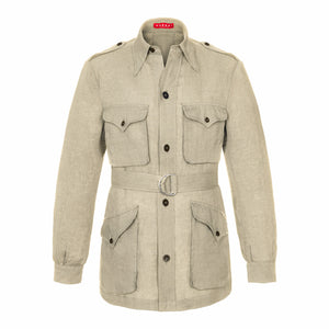 This tropical tunic is based on a World War Two Desert Rats tunic found in an old long forgotten antique shop in Marylebone, before it became gentrified. Our interpretation of the tunic features the same central box pleat, buttoning shirt cuffs and epaulets of the original, but we have simplified the belt with double D rings and angled the front waist pockets.
