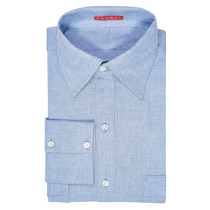 It features a modified soft one piece collar, as it is not intended to be worn with a tie, and two army style breast pockets to carry small notes, or a credit card. It features a plackett - we usually make a flat hem, and a deeper two button cuff.