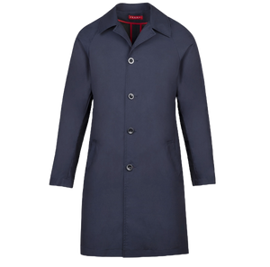 The coat is made of a PU coated cotton that keeps the elements out in a nice discrete shade of navy. This coat is designed to be worn over a jacket. Please select your jacket size. If you do not intend to wear this coat over a jacket, please order a size down from your usual jacket size.
