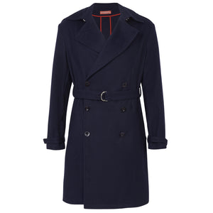 Based on an Italian trench coat from the 1970s, we chose an Italian base over an English one as we felt it had more swagger and was more contemporary with the wider wrap. We made a proper closing lapel and neck with a single wide throat hook to keep the elements out. Featuring a belted waist and sleeves with double "D" rings, these are superior in our opinion to the pronged belt and eyelets, which are more cumbersome, the eyelets tend to unravel and the belt prong tends to get bent or worse comes off.