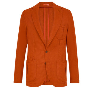 A variation of our barchetta blazer, cut in the style of a hacking jacket from orange Shetland tweed. Something a little different.