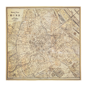A print of a vintage map of Vienna, inspired by World War Two scarves that featured maps to help airmen navigate their way to safety if they were shot down. The map is no longer accurate, but that is what map functions are for on mobile phones. We thought it would be perfect for a bandana, or a generous pocket square, 48cm by 43cm.